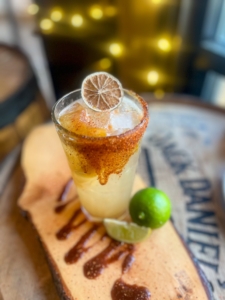 Lunazul Blanco | Fresh Peaches | Tajín and Chamoy Rim | Mike's Hot Honey | House Sour | Peach Simple