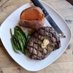 compound butter, served with baked sweet potato w/ honey cinnamon butter & garlic green beans